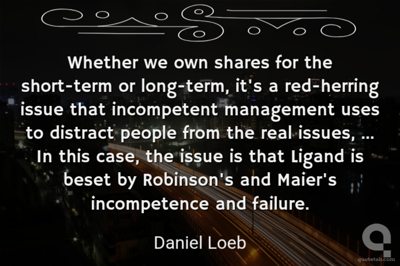 Whether we own shares for the short-term or long-term, it's a red-herring issue that incompetent management uses to distract people from the real issues, ... In this case, the issue is that Ligand is beset by Robinson's and Maier's incompetence and failure. Daniel Loeb