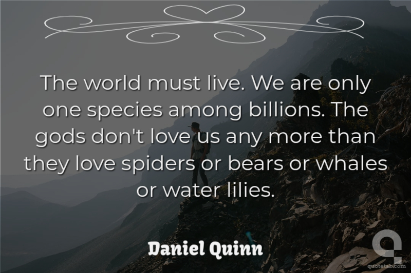 The world must live. We are only one species among billions. The gods don't love us any more than they love spiders or bears or whales or water lilies. Daniel Quinn