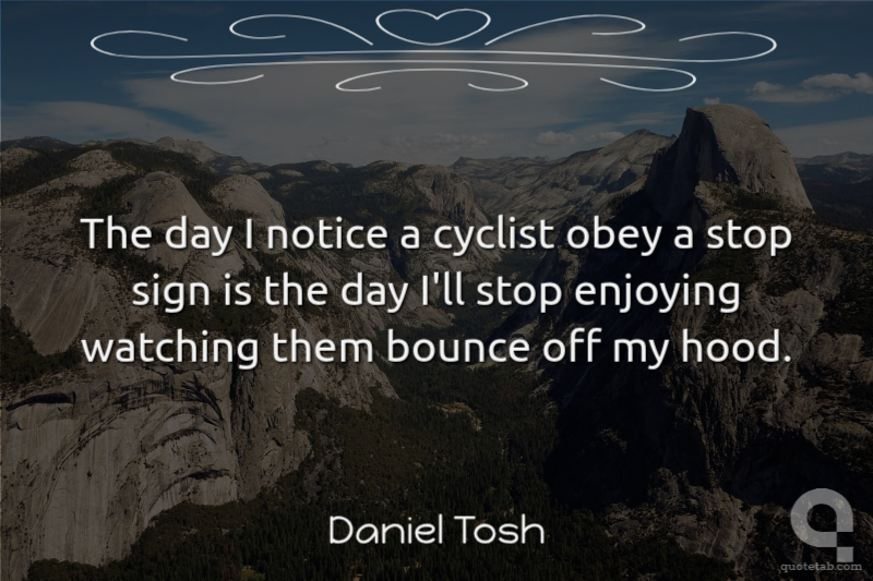 The day I notice a cyclist obey a stop sign is the day I'll stop enjoying watching them bounce off my hood. Daniel Tosh