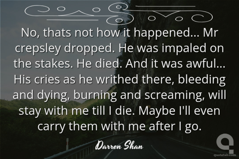 No, thats not how it happened... Mr crepsley dropped. He was impaled on the stakes. He died. And it was awful... His cries as he writhed there, bleeding and dying, burning and screaming, will stay with me till I die. Maybe I'll even carry them with me after I go. Darren Shan