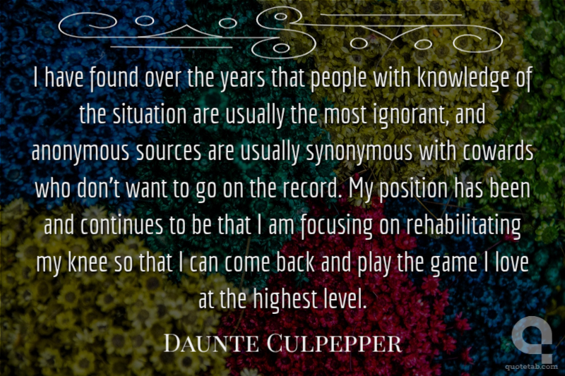 I have found over the years that people with knowledge of the situation are usually the most ignorant, and anonymous sources are usually synonymous with cowards who don't want to go on the record. My position has been and continues to be that I am focusing on rehabilitating my knee so that I can come back and play the game I love at the highest level. Daunte Culpepper