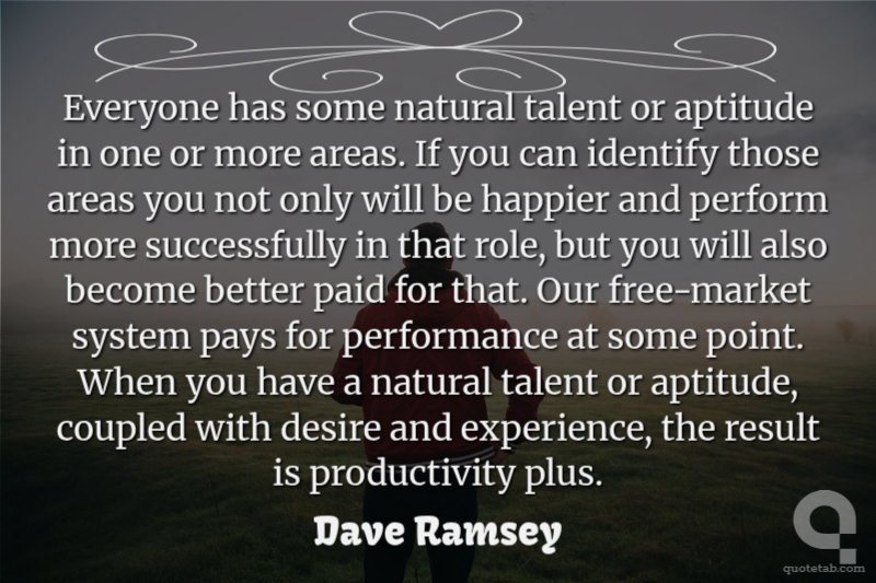 Everyone has some natural talent or aptitude in one or more areas. If you can identify those areas you not only will be happier and perform more successfully in that role, but you will also become better paid for that. Our free-market system pays for performance at some point. When you have a natural talent or aptitude, coupled with desire and experience, the result is productivity plus. Dave Ramsey