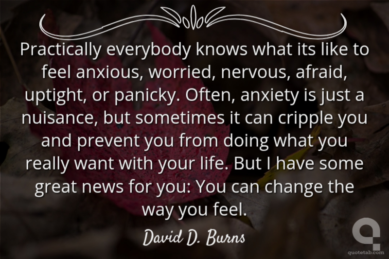 Practically everybody knows what its like to feel anxious, worried, nervous, afraid, uptight, or panicky. Often, anxiety is just a nuisance, but sometimes it can cripple you and prevent you from doing what you really want with your life. But I have some great news for you: You can change the way you feel. David D. Burns