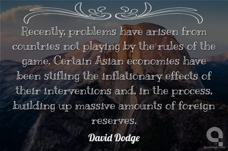 Recently, problems have arisen from countries not playing by the rules of the game. Certain Asian economies have been stifling the inflationary effects of their interventions and, in the process, building up massive amounts of foreign reserves. David Dodge