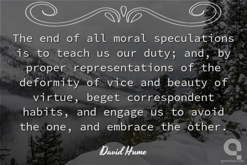 The end of all moral speculations is to teach us our duty; and, by proper representations of the deformity of vice and beauty of virtue, beget correspondent habits, and engage us to avoid the one, and embrace the other. David Hume