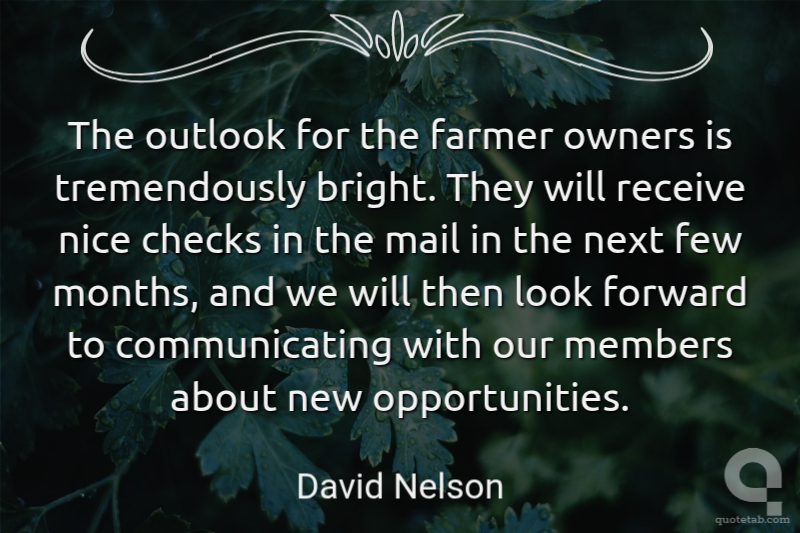The outlook for the farmer owners is tremendously bright. They will receive nice checks in the mail in the next few months, and we will then look forward to communicating with our members about new opportunities. David Nelson