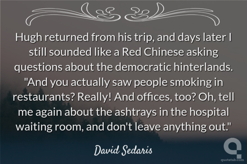 Hugh returned from his trip, and days later I still sounded like a Red Chinese asking questions about the democratic hinterlands. "And you actually saw people smoking in restaurants? Really! And offices, too? Oh, tell me again about the ashtrays in the hospital waiting room, and don't leave anything out." David Sedaris