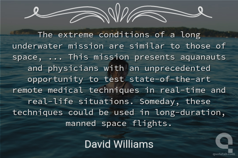 The extreme conditions of a long underwater mission are similar to those of space, ... This mission presents aquanauts and physicians with an unprecedented opportunity to test state-of-the-art remote medical techniques in real-time and real-life situations. Someday, these techniques could be used in long-duration, manned space flights. David Williams