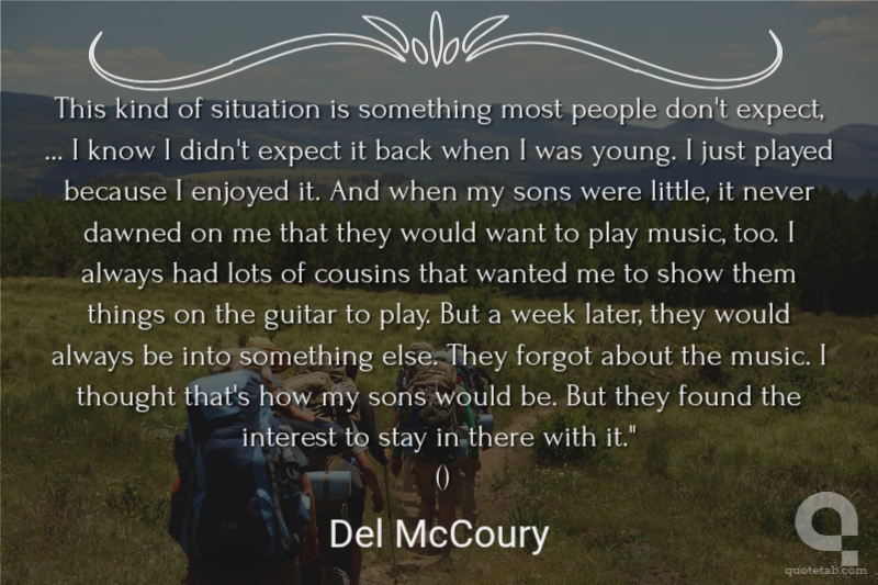 This kind of situation is something most people don't expect, ... I know I didn't expect it back when I was young. I just played because I enjoyed it. And when my sons were little, it never dawned on me that they would want to play music, too. I always had lots of cousins that wanted me to show them things on the guitar to play. But a week later, they would always be into something else. They forgot about the music. I thought that's how my sons would be. But they found the interest to stay in there with it." () Del McCoury