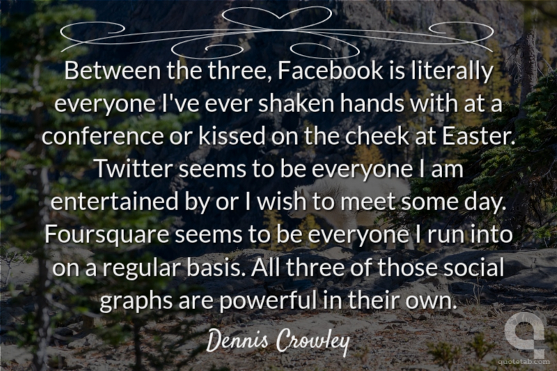 Between the three, Facebook is literally everyone I've ever shaken hands with at a conference or kissed on the cheek at Easter. Twitter seems to be everyone I am entertained by or I wish to meet some day. Foursquare seems to be everyone I run into on a regular basis. All three of those social graphs are powerful in their own. Dennis Crowley