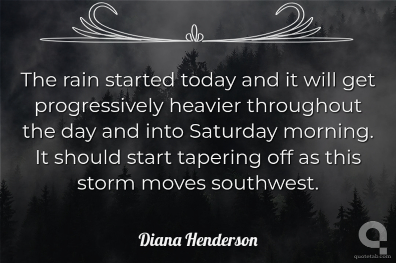 The rain started today and it will get progressively heavier throughout the day and into Saturday morning. It should start tapering off as this storm moves southwest. Diana Henderson