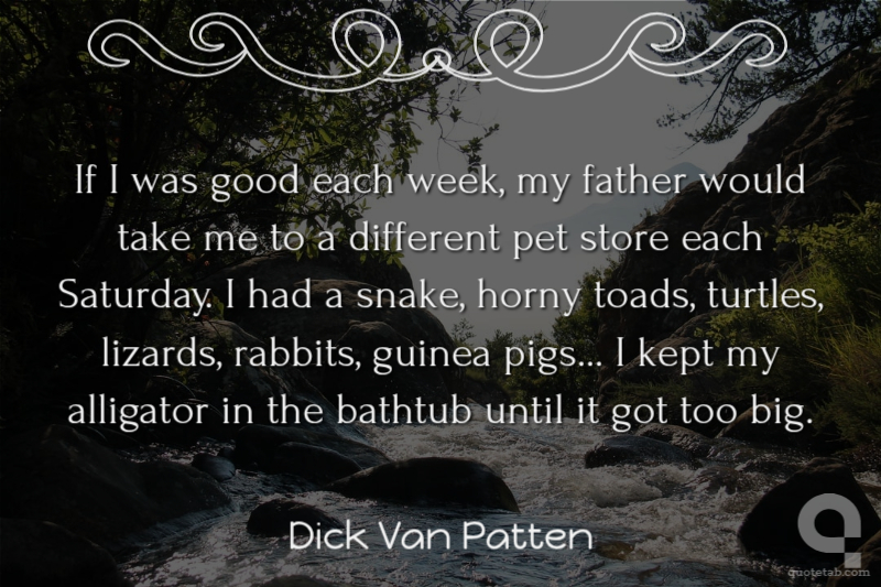 If I was good each week, my father would take me to a different pet store each Saturday. I had a snake, horny toads, turtles, lizards, rabbits, guinea pigs... I kept my alligator in the bathtub until it got too big. Dick Van Patten