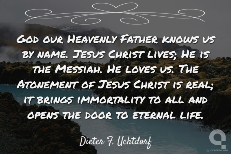God our Heavenly Father knows us by name. Jesus Christ lives; He is the Messiah. He loves us. The Atonement of Jesus Christ is real; it brings immortality to all and opens the door to eternal life. Dieter F. Uchtdorf