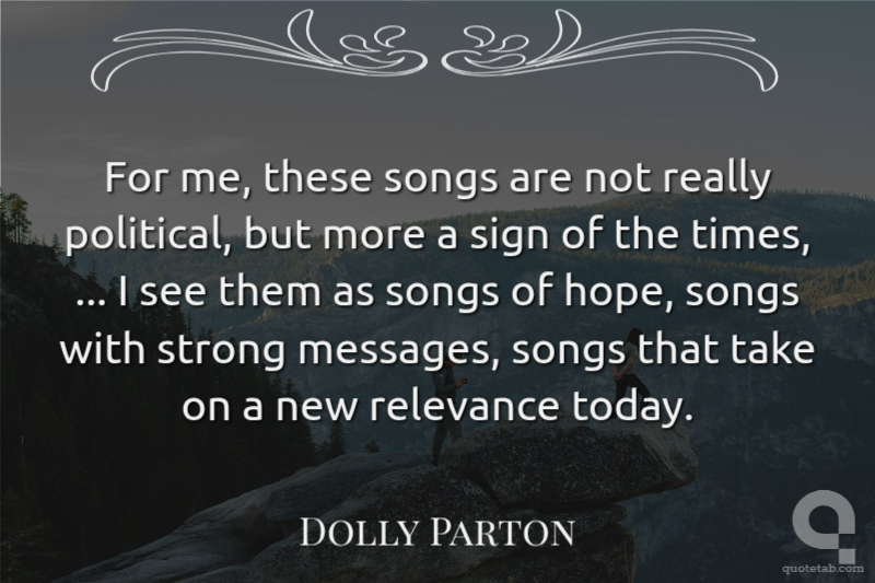 For me, these songs are not really political, but more a sign of the times, ... I see them as songs of hope, songs with strong messages, songs that take on a new relevance today. Dolly Parton
