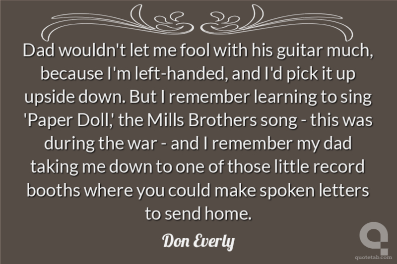 Dad wouldn't let me fool with his guitar much, because I'm left-handed, and I'd pick it up upside down. But I remember learning to sing 'Paper Doll,' the Mills Brothers song - this was during the war - and I remember my dad taking me down to one of those little record booths where you could make spoken letters to send home. Don Everly