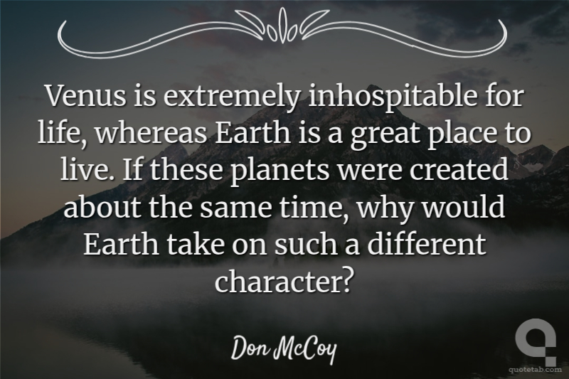 Venus is extremely inhospitable for life, whereas Earth is a great place to live. If these planets were created about the same time, why would Earth take on such a different character? Don McCoy
