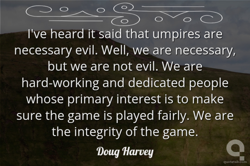 I've heard it said that umpires are necessary evil. Well, we are necessary, but we are not evil. We are hard-working and dedicated people whose primary interest is to make sure the game is played fairly. We are the integrity of the game. Doug Harvey