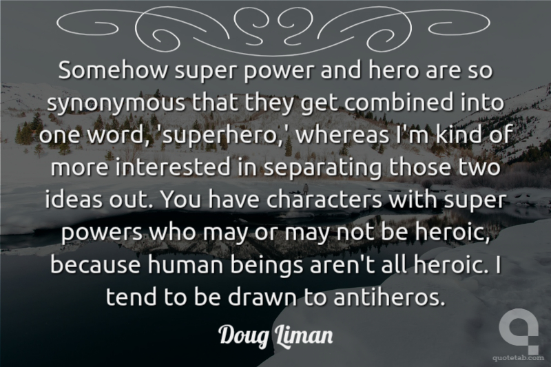 Somehow super power and hero are so synonymous that they get combined into one word, 'superhero,' whereas I'm kind of more interested in separating those two ideas out. You have characters with super powers who may or may not be heroic, because human beings aren't all heroic. I tend to be drawn to antiheros. Doug Liman