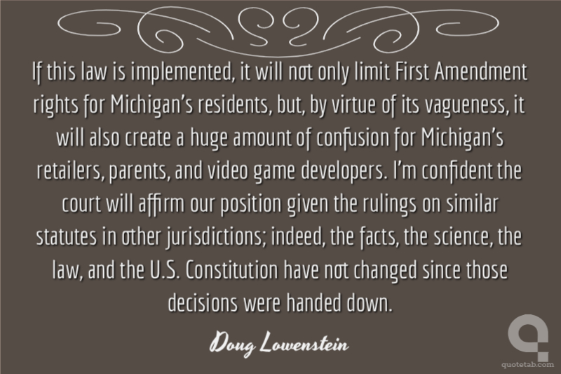 If this law is implemented, it will not only limit First Amendment rights for Michigan's residents, but, by virtue of its vagueness, it will also create a huge amount of confusion for Michigan's retailers, parents, and video game developers. I'm confident the court will affirm our position given the rulings on similar statutes in other jurisdictions; indeed, the facts, the science, the law, and the U.S. Constitution have not changed since those decisions were handed down. Doug Lowenstein
