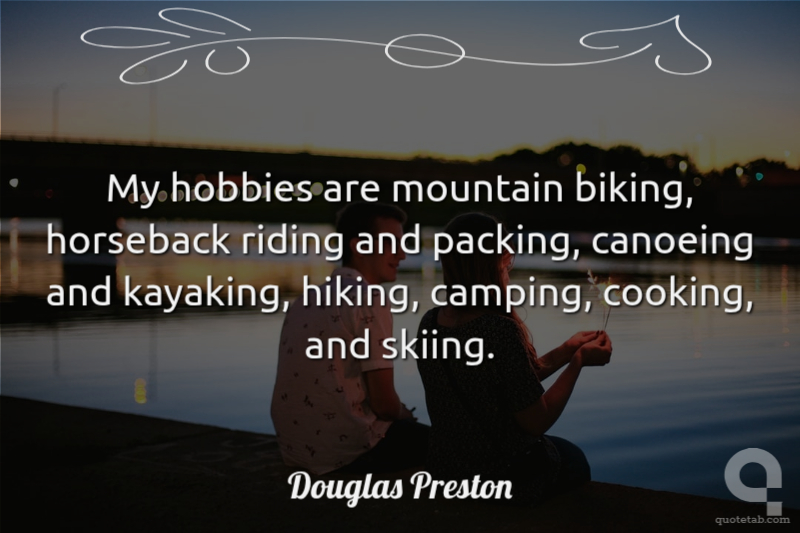 My hobbies are mountain biking, horseback riding and packing, canoeing and kayaking, hiking, camping, cooking, and skiing. Douglas Preston