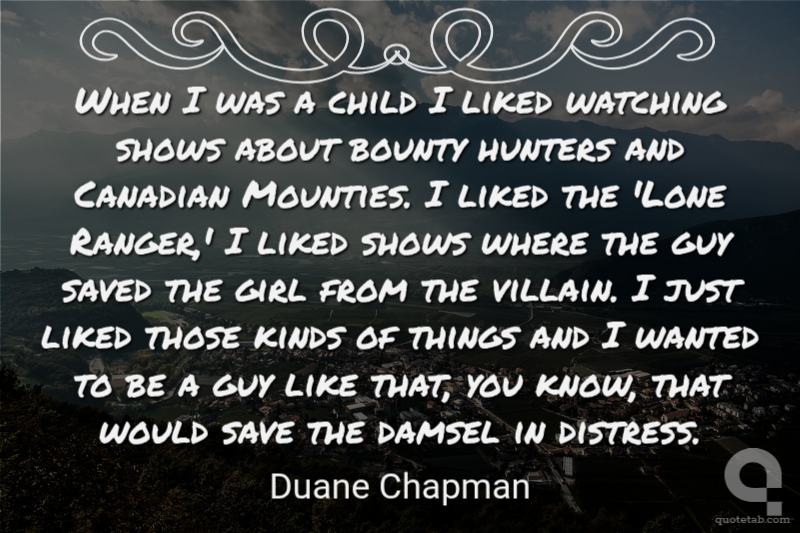 When I was a child I liked watching shows about bounty hunters and Canadian Mounties. I liked the 'Lone Ranger,' I liked shows where the guy saved the girl from the villain. I just liked those kinds of things and I wanted to be a guy like that, you know, that would save the damsel in distress. Duane Chapman