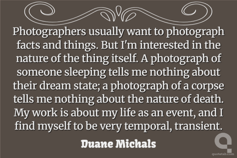 Photographers usually want to photograph facts and things. But I'm interested in the nature of the thing itself. A photograph of someone sleeping tells me nothing about their dream state; a photograph of a corpse tells me nothing about the nature of death. My work is about my life as an event, and I find myself to be very temporal, transient. Duane Michals