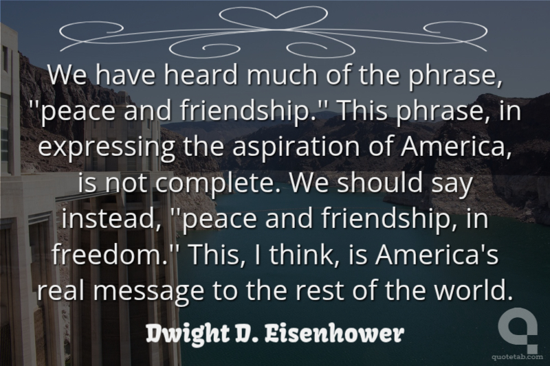We have heard much of the phrase, ''peace and friendship.'' This phrase, in expressing the aspiration of America, is not complete. We should say instead, ''peace and friendship, in freedom.'' This, I think, is America's real message to the rest of the world. Dwight D. Eisenhower
