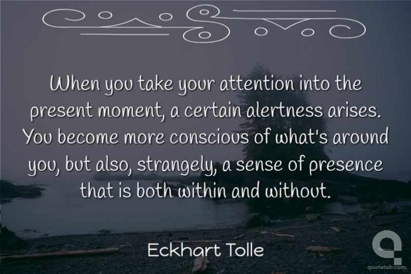 When you take your attention into the present moment, a certain alertness arises. You become more conscious of what's around you, but also, strangely, a sense of presence that is both within and without. Eckhart Tolle