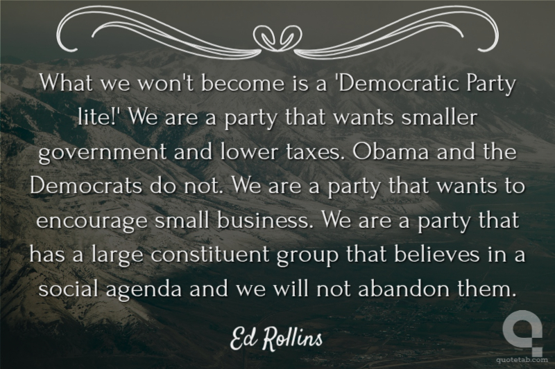 What we won't become is a 'Democratic Party lite!' We are a party that wants smaller government and lower taxes. Obama and the Democrats do not. We are a party that wants to encourage small business. We are a party that has a large constituent group that believes in a social agenda and we will not abandon them. Ed Rollins