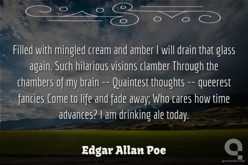 Filled with mingled cream and amber I will drain that glass again. Such hilarious visions clamber Through the chambers of my brain -- Quaintest thoughts -- queerest fancies Come to life and fade away; Who cares how time advances? I am drinking ale today. Edgar Allan Poe