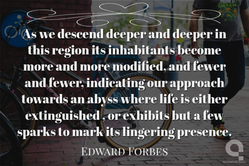 As we descend deeper and deeper in this region its inhabitants become more and more modified, and fewer and fewer, indicating our approach towards an abyss where life is either extinguished , or exhibits but a few sparks to mark its lingering presence. Edward Forbes