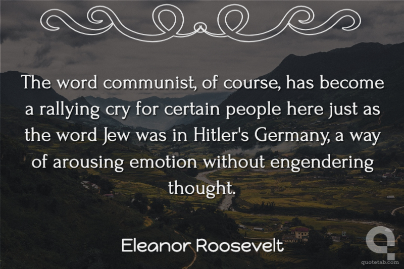 The word communist, of course, has become a rallying cry for certain people here just as the word Jew was in Hitler's Germany, a way of arousing emotion without engendering thought. Eleanor Roosevelt
