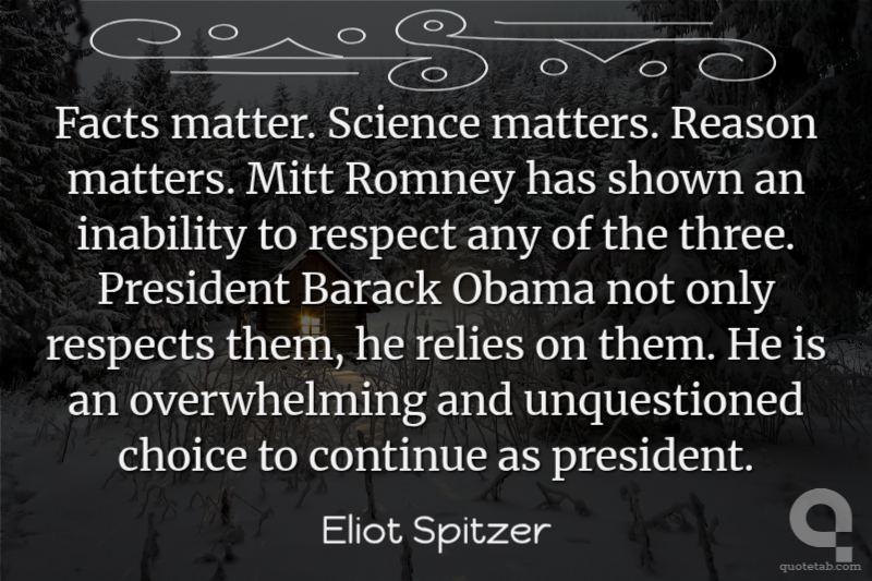 Facts matter. Science matters. Reason matters. Mitt Romney has shown an inability to respect any of the three. President Barack Obama not only respects them, he relies on them. He is an overwhelming and unquestioned choice to continue as president. Eliot Spitzer