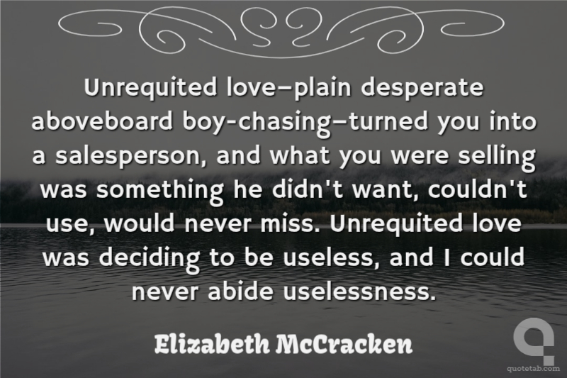 Unrequited love–plain desperate aboveboard boy-chasing–turned you into a salesperson, and what you were selling was something he didn't want, couldn't use, would never miss. Unrequited love was deciding to be useless, and I could never abide uselessness. Elizabeth McCracken
