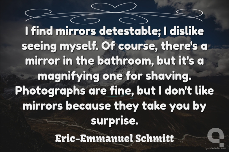 I find mirrors detestable; I dislike seeing myself. Of course, there's a mirror in the bathroom, but it's a magnifying one for shaving. Photographs are fine, but I don't like mirrors because they take you by surprise. Eric-Emmanuel Schmitt