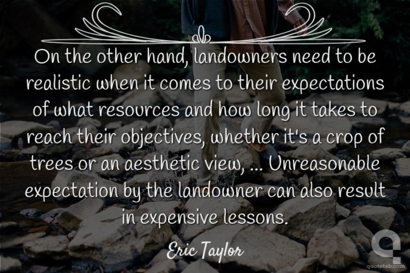On the other hand, landowners need to be realistic when it comes to their expectations of what resources and how long it takes to reach their objectives, whether it's a crop of trees or an aesthetic view, ... Unreasonable expectation by the landowner can also result in expensive lessons. Eric Taylor
