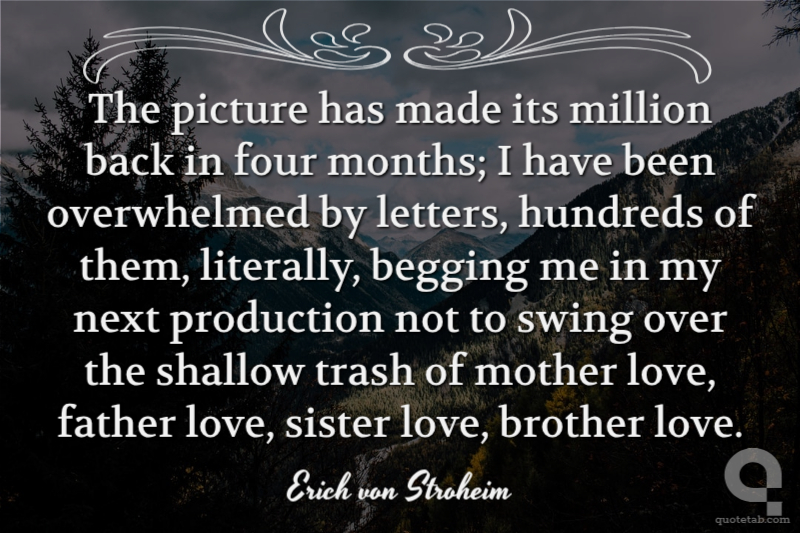 The picture has made its million back in four months; I have been overwhelmed by letters, hundreds of them, literally, begging me in my next production not to swing over the shallow trash of mother love, father love, sister love, brother love. Erich von Stroheim