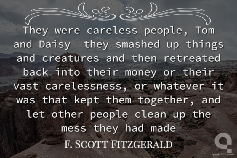 Nick, on the Buchanans: ""They were careless people, Tom and Daisy -- they smashed up things and creatures and then retreated back into their money or their vast carelessness or whatever it was that kept them together, and let other people clean up the mess they had made F. Scott Fitzgerald