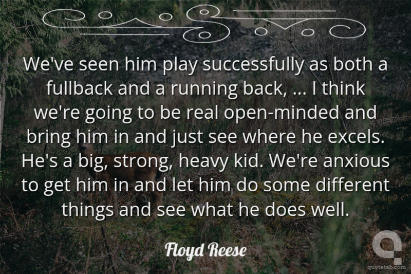 We've seen him play successfully as both a fullback and a running back, ... I think we're going to be real open-minded and bring him in and just see where he excels. He's a big, strong, heavy kid. We're anxious to get him in and let him do some different things and see what he does well. Floyd Reese