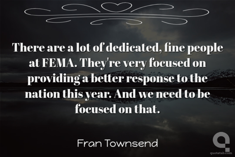 There are a lot of dedicated, fine people at FEMA. They're very focused on providing a better response to the nation this year. And we need to be focused on that. Fran Townsend