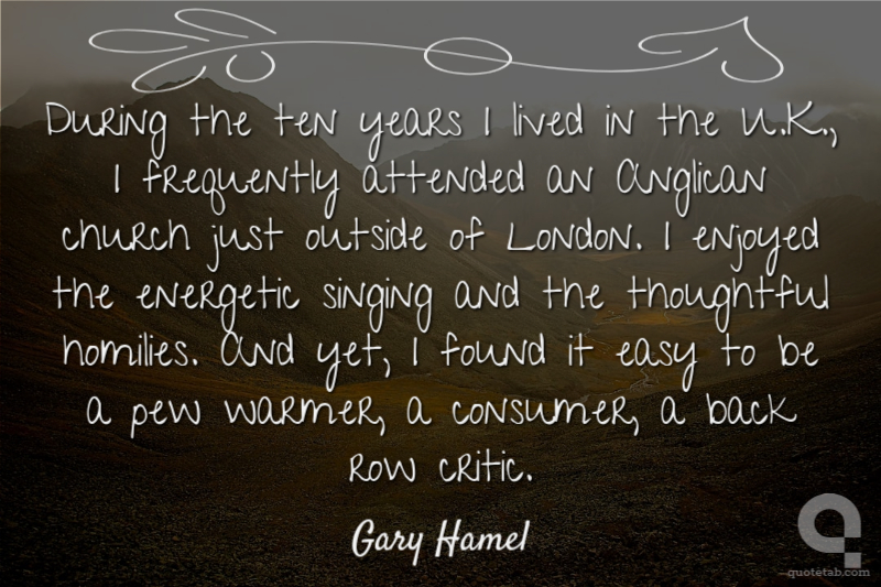 During the ten years I lived in the U.K., I frequently attended an Anglican church just outside of London. I enjoyed the energetic singing and the thoughtful homilies. And yet, I found it easy to be a pew warmer, a consumer, a back row critic. Gary Hamel