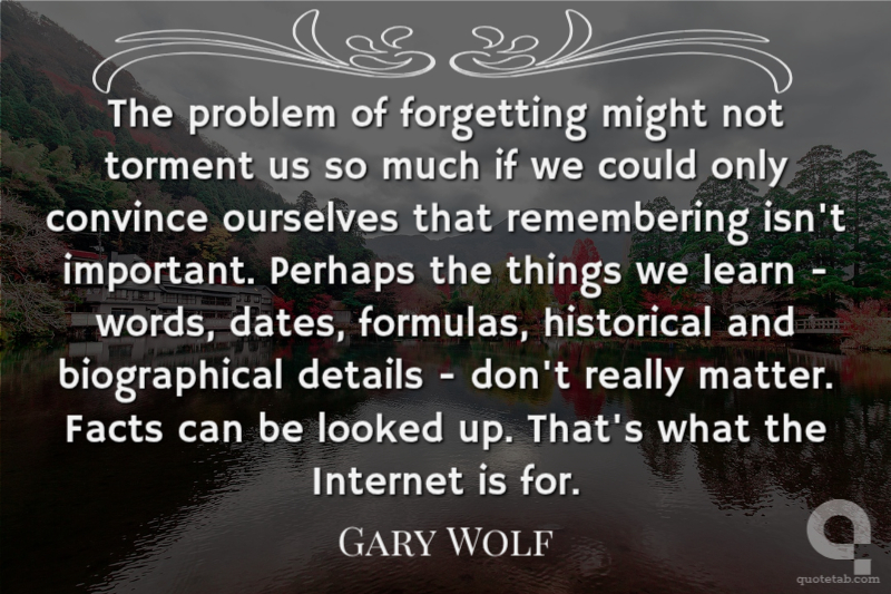 The problem of forgetting might not torment us so much if we could only convince ourselves that remembering isn't important. Perhaps the things we learn - words, dates, formulas, historical and biographical details - don't really matter. Facts can be looked up. That's what the Internet is for. Gary Wolf