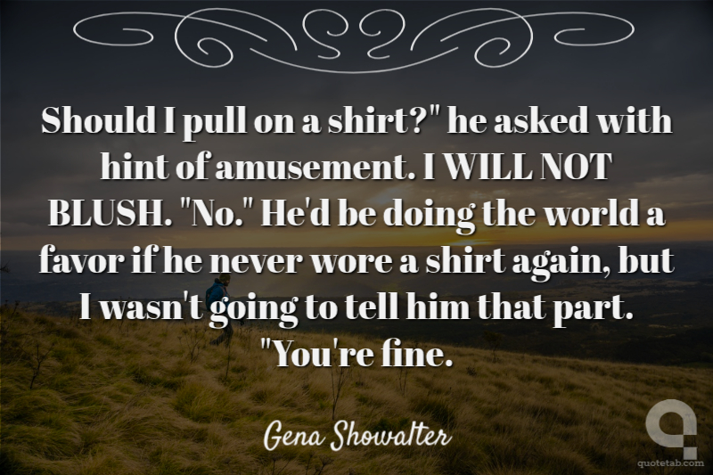Should I pull on a shirt?" he asked with hint of amusement. I WILL NOT BLUSH. "No." He'd be doing the world a favor if he never wore a shirt again, but I wasn't going to tell him that part. "You're fine. Gena Showalter
