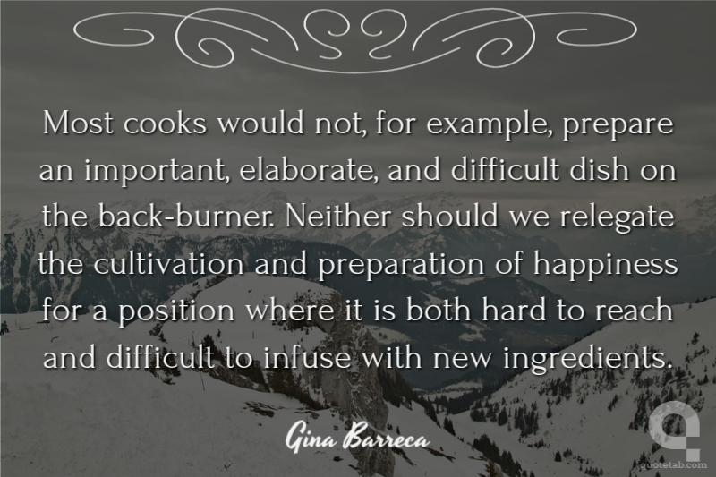 Most cooks would not, for example, prepare an important, elaborate, and difficult dish on the back-burner. Neither should we relegate the cultivation and preparation of happiness for a position where it is both hard to reach and difficult to infuse with new ingredients. Gina Barreca