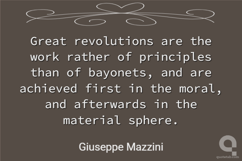 Great revolutions are the work rather of principles than of bayonets, and are achieved first in the moral, and afterwards in the material sphere. Giuseppe Mazzini