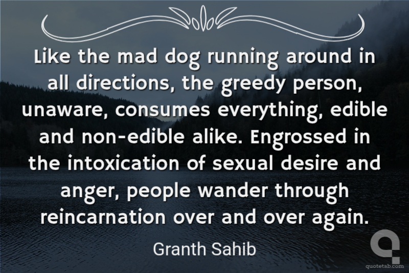 Like the mad dog running around in all directions, the greedy person, unaware, consumes everything, edible and non-edible alike. Engrossed in the intoxication of sexual desire and anger, people wander through reincarnation over and over again. Granth Sahib