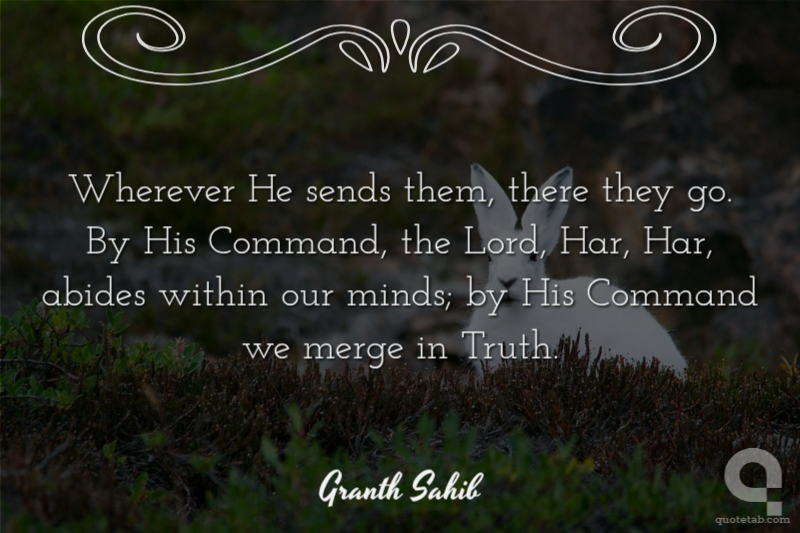 Wherever He sends them, there they go. By His Command, the Lord, Har, Har, abides within our minds; by His Command we merge in Truth. Granth Sahib