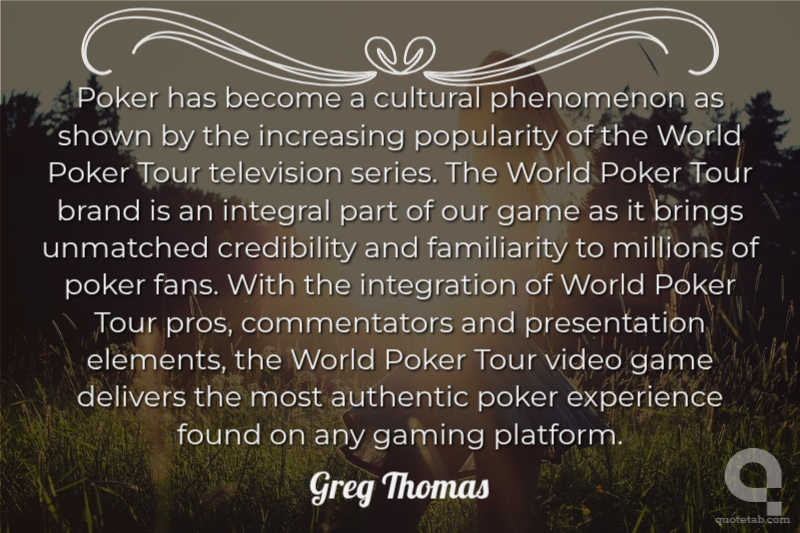 Poker has become a cultural phenomenon as shown by the increasing popularity of the World Poker Tour television series. The World Poker Tour brand is an integral part of our game as it brings unmatched credibility and familiarity to millions of poker fans. With the integration of World Poker Tour pros, commentators and presentation elements, the World Poker Tour video game delivers the most authentic poker experience found on any gaming platform. Greg Thomas