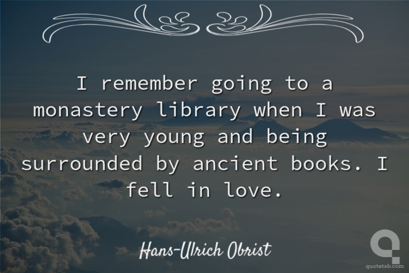 I remember going to a monastery library when I was very young and being surrounded by ancient books. I fell in love. Hans-Ulrich Obrist