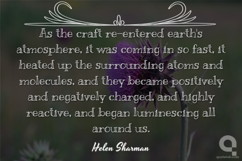 As the craft re-entered earth's atmosphere, it was coming in so fast, it heated up the surrounding atoms and molecules, and they became positively and negatively charged, and highly reactive, and began luminescing all around us. Helen Sharman